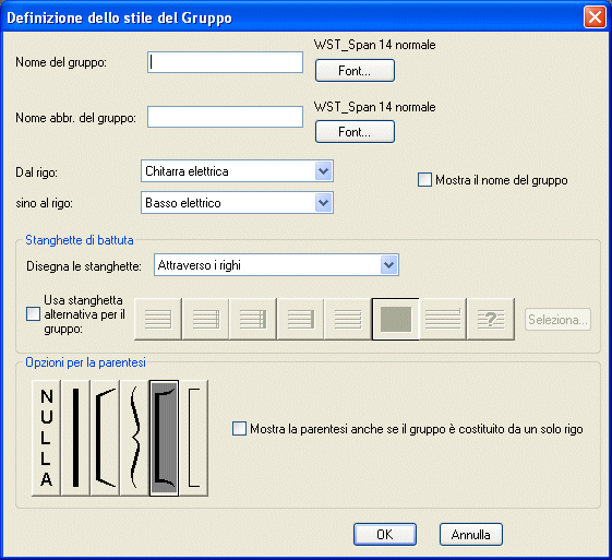 Questa finestra di dialogo vi permette di creare una nuova configurazione per lo stile dei gruppi o di modificare quelli esistenti. Le opzioni e le funzionalità sono simili a quelle presenti nella finestra di dialogo Attributi del gruppo di righi.