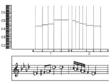 Accorgimento: quando l'opzione Durate delle note è selezionata nel Menu Strumento MIDI, i righelli verticali appariranno sul lato sinistro, rappresentando le altezze, in conformità con le opzioni per la visualizzazione delle altezze configurate nella finestra di dialogo Opzioni del programma - Viste. Tutte le altezze sono rappresentate con il rispettivo numero di nota MIDI (60 = Do centrale) o come altezze musicali, dove C4 (o C3 o C5) indica il Do centrale. Una maniglia appare su ciascuna nota e una linea orizzontale ne rappresenta la durata (momento iniziale e momento finale della nota).