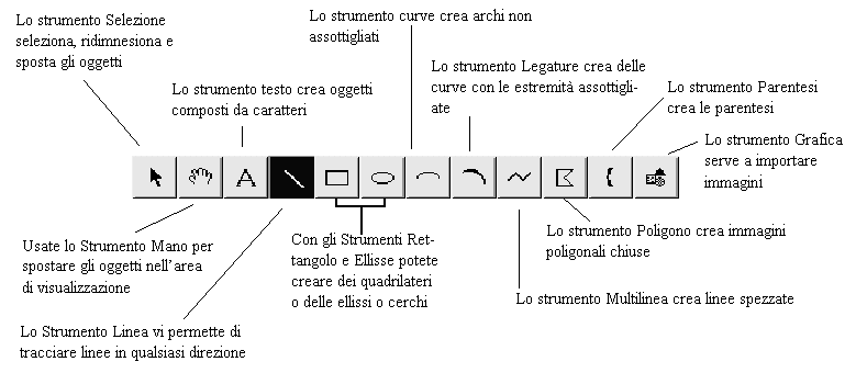 Ecco un sommario degli Strumenti contenuti sul lato superiore della finestra dello Strumento-Disegno:
