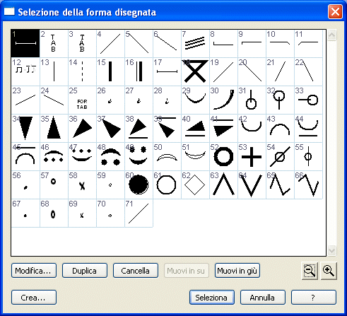 Quando state modificando o creando una nuova espressione disegnata, una definizione di layout di testo, o state modificando una gambetta, una Forma eseguibile o una pausa multimisura, questa finestra di dialogo vi permette di scegliere la forma di base. Se il file predefinito, ossia il vostro file di default di Finale, non è al posto giusto, e non avete caricato una libreria di Espressioni disegnate o creato una forma da voi stessi, non comparirà alcun elemento nell’area di visualizzazione della finestra di dialogo.