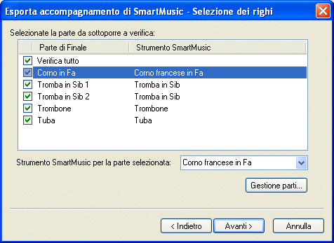 - Cliccate su Avanti. Apparirà la finestra di dialogo Esporta accompagnamento di SmartMusic - Selezione dei righi di accompagnamento.