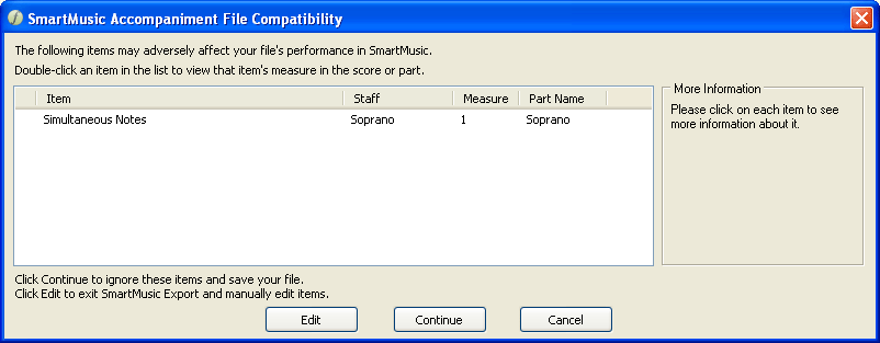 Alcuni elementi delle partiture che potete creare con Finale non sono compatibili con SmartMusic. Alcuni di questi elementi di conflitto possono andare a scapito dell'accuratezza della valutazione, altri possono causare problemi nella navigazione in SmartMusic, altri ancora non sono semplicemente supportati da SmartMusic. Se il file che volete esportare in SmartMusic contiene alcuni di questi elementi, la finestra di dialogo viene aperta per fornirvi un elenco dettagliato dei problemi, una descrizione specifica di ciascun conflitto e delle sue conseguenze e la possibilità di risolvere immediatamente il problema stesso.