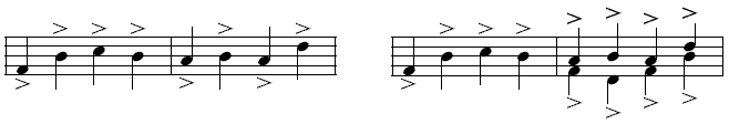 Selezionate l'opzione Automaticamente sul lato nota/sul lato gambo per permettere a Finale di stabilire se l’articolazione debba essere posizionata sul lato della nota o sul lato del gambo. Ad esempio, se l’inserimendo di un altro livello di musica comporta la suddivisione dei gambi, le articolazioni verranno automaticamente spostate sul lato del gambo delle note (come mostrato nell’esempio riportato qui sotto).