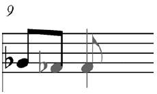 . Cliccate sulla prima nota di misura 9 (il Sol bemolle). Adesso al posto del Sol bemolle apparirà un Sol diesis. Notate anche che Finale metterà automaticamente il bemolle al secondo Sol, in quanto non è più specificato prima. Poiché le alterazioni che abbiamo inserito e cambiato sono del tutto arbitrarie e poco adeguate alla nostra, procediamo ad eliminarle.