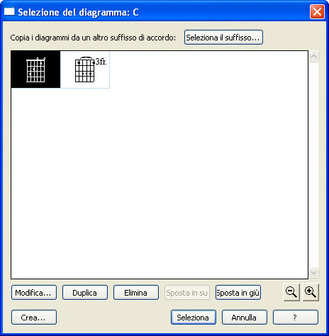 La finestra di dialogo Selezione del diagramma mostra tutti i diagrammi degli accordi creati (o caricati all’interno di una libreria) presenti nel documento. Questo vi consente di selezionare, cancellare o modificare uno qualsiasi dei diagrammi presenti; vi consente anche di raggiungere la finestra Editor del diagramma per chitarra, dove potete disegnare e impostare dei nuovi diagrammi. Il numero presente nell’angolo superiore sinistro di ciascuna casella indica appunto il numero di incasellamento del diagramma. In questo modo risulta più agevole inserire direttamente nelle varie finestre di dialogo il numero della casella anziché scorrere attraverso tutta la finestra di selezione.