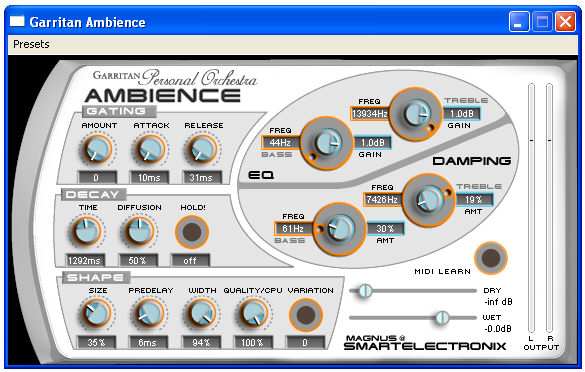 “Il riverbero è il fenomeno che si verifica quando in un determinato spazio viene generato un suono. Ogniqualvolta viene prodotto un suono, esso si diffonde in tutte le direzioni dello spazio circostante. Quando il suono che si irradia incontra un ostacolo, come un muro, viene riflesso o assorbito. Le nostre orecchie e il nostro cervello riconoscono questi segnali e ci forniscono informazioni in merito al tipo di spazio, di ambiente, nel quale ci troviamo. Così come lo spazio acustico conferisce caratteristiche specifiche ai suoni, il riverbero permette di conferire una tridimensionalità al suono degli strumenti. Il riverbero può inoltre livellare il suono di alcuni strumenti al fine di ottenere un risultato più omogeneo in fase di missaggio. Di tutti gli effetti che possono essere applicati alla musica, il riverbero è sicuramente il più usato in quanto emula una situazione realistica, proponendoci un ascolto ambientato. Il plug-in Ambience™ Reverb è un riverbero di qualità eccellente che può dirsi in grado di gareggiare con i riverberi più famosi in commercio. Ambience vi permette di simulare il riverbero di una sala da concerto e molti altri spazi e ambienti tipici adibiti ad esecuzioni musicali. Inclusi con Ambience ci sono delle configurazioni predefinite specificamente pensate per gli strumenti della Garritan Personal Orchestra. Queste configurazioni predefinite comprendono le sale da concerto, una cattedrale, le sale da ballo, i salotti, le hall e molto altri spazi tipici dell’esecuzione musicale. Potete, naturalmente, configurare i vostri spazi musicali personali con Ambience.”