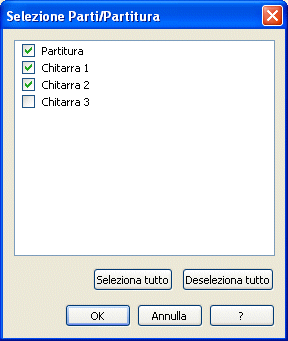 Attraverso questa finestra di dialogo potete selezionare le parti e la partitura, secondo le vostre esigenze, alle quali volete apportare delle modifiche in modo “collegato”. In altre parole, se selezionate più parti, le modifiche che apporterete in una di queste verranno apportate automaticamente anche nelle altre.