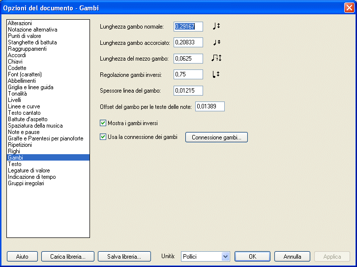 Utilizzando queste opzioni potrete controllare e determinare tutte le caratteristiche relative ai gambi delle note, come la loro altezza, lo spessore, il posizionamento dei gambi inversi. Potrete anche impostare le caratteristiche relative alla connessione dei gambi.