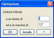 Dal menu Strumento MIDI scegliete Modifica Key Velocity. Se vi trovate nella mezza-finestra dello Strumento MIDI, selezionate la regione su cui volete operare trascinando il mouse lungo l’area di visualizzazione “grafica” o selezionando le maniglie delle singole note i cui dati MIDI volete editare. Scegliete Limitazione dal menu Strumento-MIDI.