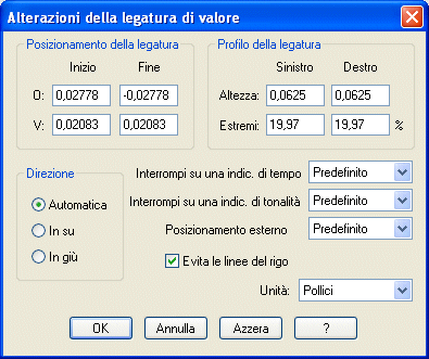 Usate la finestra Alterazioni della legatura di valore per cambiare la forma ed il posizionamento di legature individuali nello spartito. I settaggi nella finestra Alterazioni della legatura di valore hanno il sopravvento sui settaggi globali delle legature nella finestra di dialogo Opzioni del documento-Legature di valore e nella finestra di dialogo Profilo della legatura. Per modificare tutte le legature nel vostro documento globalmente, scegliete Opzioni del documento dal menu Opzioni e selezionate la voce Legature di valore per visualizzare nella finestra di dialogo la relativa pagina di opzioni. Si veda la finestra di dialogo Opzioni del documento-Legature di valore e la finestra di dialgoo Profilo delle legature di valore.