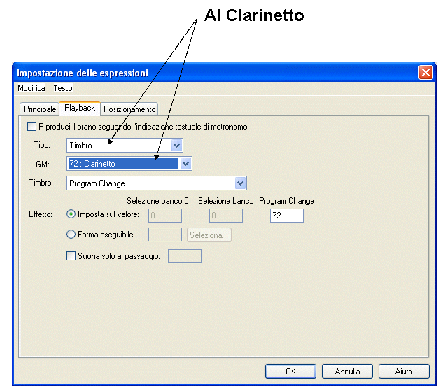 Selezionando Timbro e definendo un numero di Program Change nel box “Imposta sul valore” è possibile definire un suono da impiegarsi quando si incontra l’Espressione legata al rigo “Al Clarinetto”.