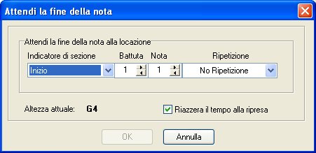 Dal menu Utilità scegliete Marker di SmartMusic. Nella parte sinistra della finestra di dialogo che apparirà (un elenco delle varie tipologie di markers disponibili) selezionate Attendi la fine nota e cliccate su Aggiungi. Nel caso abbiate già inserito in precedenza un marker di questo tipo, selezionatelo nella parte centrale della finestra di dialogo e cliccate su Modifica. In entrambi i casi apparirà la finestra di dialogo Marker Attendi la fine della nota.