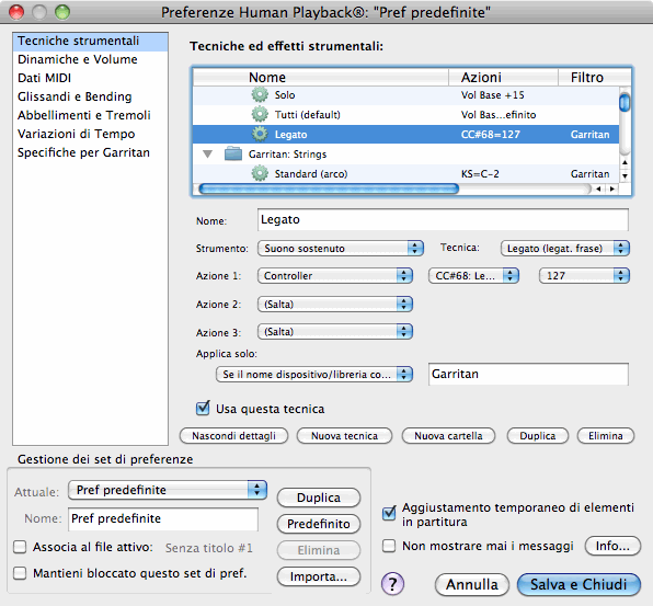 Le opzioni contenute in questa sezione della finestra di dialogo Preferenze di Human Playback determinano il modo in cui Human Playback interpreta le tecniche di esecuzione specifiche degli strumenti (come il pizzicato, il mute, e così via). Potete abilitare o disabilitare le singole tecniche e personalizzarle per adeguarle ancor meglio alle vostre esigenze. Il set Preferenze predefinite contiene le impostazioni predefinite per le tecniche e gli effetti strumentali che vengono utilizzate con gli strumenti della GPO nella versione integrale, nella versione per FInale e in quella JABB, nonché per il violino solo Stradivari. Molte di queste tecniche sono vincolate agli strumenti dotati di keyswitch;. per poterne sentire gli effetti in playback devono essere caricate queste versioni degli strumenti e devono essere utilizzate in partitura le apposite espressioni, articolazioni, ecc, configurate come attivatori delle tecniche - si veda la sezione Keyswitches.