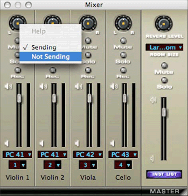 Il mixer di Finale viene visualizzato in una finestra separata, proprio come un banco di missaggio reale, con gli slider per il volume, la manopola per la panoramica e i pulsanti per il Mute, per il Solo e per la registrazione. Questi controlli sono disponibili per ogni singolo strumento (ad ogni strumento in partitura è riservato un modulo di controlli) e si trovano anche sul modulo dei controlli generali, detti controlli Master (il modulo di controlli collocato sul bordo destro del mixer). Vi proponiamo qui sotto l’immagine del mixer di una partitura per quartetto d’archi: