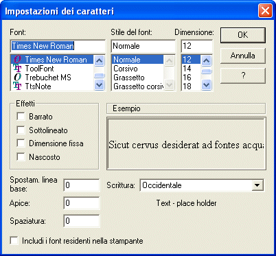 Voi siete qui: Manuale di riferimento > Finestre di dialogo > I > Impostazioni dei caratteri