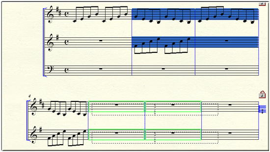Per copiare e incollare/inserire blocchi di misure verticali utilizzate le definizioni di sorgente e destinazione descritte appena sopra e seguite la procedura che più vi aggrada tra quelle fornite nei paragrafi Copiare e incollare la musica utilizzando gli appunti, Copiare e incollare la musica per trascinamento, Copiare e inserire la musica utilizzando gli appunti o Copiare e inserire la musica per trascinamento. Durante la copiatura per trascinamento (sia che si incolli la musica, sia che la si inserisca) utilizzate il bordo verde o il cursore di inserimento per avere conferma che la regione di destinazione è adeguata ad accettare un blocco di misure verticale.