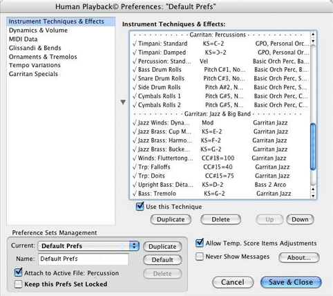 Se, invece, preferite utilizzare le rullate create da Human Playback al posto di quelle campionate, dovete disattivare la tecnica nella sezione Tecniche ed effetti strumentali della finestra di dialogo Preferenze di Human Playback.