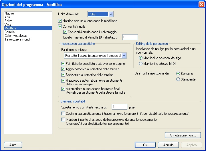 In questa sezione della finestra di dialogo potrete specificare le impostazioni per la funzione di Annulla del menu Modifica, le impostazioni per gli elementi spostabili e le annotazioni sui caratteri.