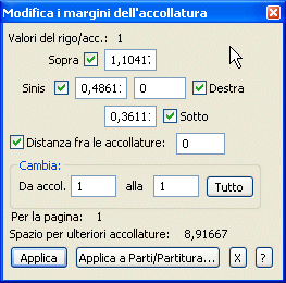 - Cambia: Da accollatura ___ alla ___ • Seleziona tutto. Selezionate quali accollature volete siano influenzate dai margini specificati inserendo gli estremi dell’ambito in questi campi di testo. Selezionate un’accollatura specifica, tutte le accollature (cliccando sul pulsante Seleziona tutto) o un determinato ambito di accollature (per selezionare da un’accollatura sino alla fine del brano, è sufficiente inserire il numero dell’accollatura iniziale nel campo di testo Da accollatura ___ e il numero zero nel campo di testo alla ___ ).