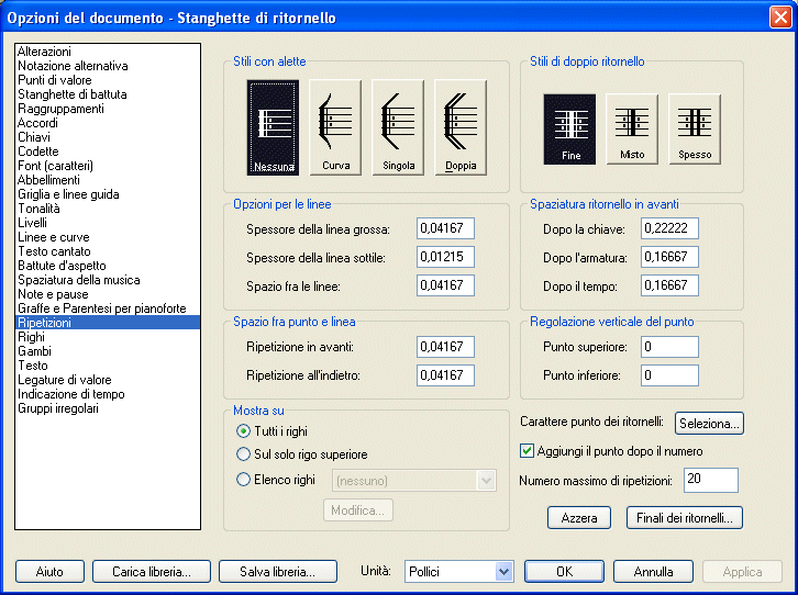 Dal menu Documento selezionate Opzioni del documento, si aprirà la finestra di dialogo Opzioni del documento. Nella parte sinistra della finestra di dialogo selezionate la voce Ripetizioni. Apparirà la relativa maschera di opzioni nella parte destra della finestra di dialogo.