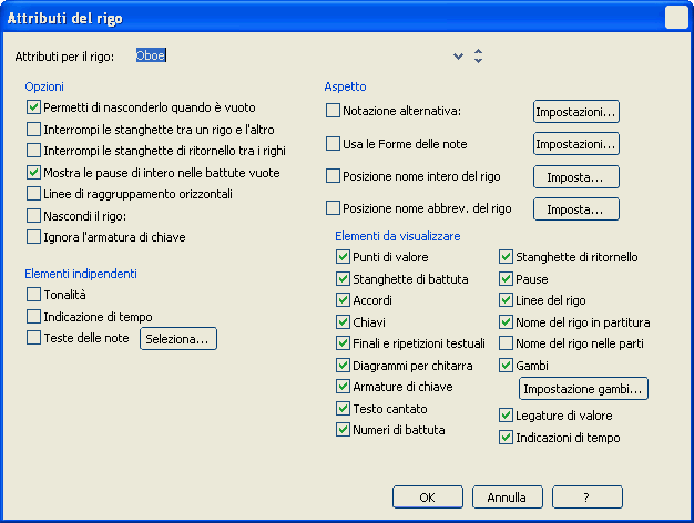 “Indipendenti” significa che questi elementi possono essere impostati diversamente per ogni rigo della partitura. Queste opzioni vi permettono di specificare le indicazioni di chiave, di tempo, il font musicale o la forma delle teste delle note in modo indipendentemente per ogni rigo.