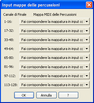 Se volete configurare una periferica MIDI esterna in modo che la sua mappatura delle percussioni venga utilizzata per il playback potete specificare voi stessi le note MIDI nella finestra di dialogo Impostazione della configurazione delle percussioni.
