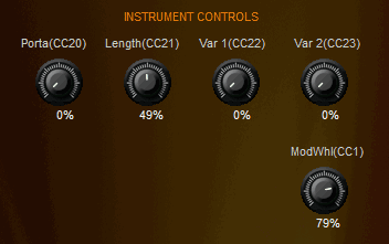 - Porta (CC20): Tutti gli strumenti a fiato e ad arco sono dotati di questa funzione di slide (CC#18). Questo controllo è particolarmente utilizzato quando si lavora con strumenti come il trombone o con gli strumenti a corda, per i quali l’effetto di slide è normale. Può anche essere utilizzato con altri strumenti a fiato per ricreare l’effetto di raggiungimento dell’altezza di destinazione attraverso un movimento per ampi intervalli.