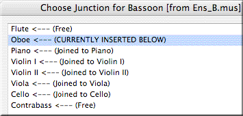 Dal menu File scegliete Riunione partiture. Apparirà la Finestra di dialogo Riunione partitura (Score Merger). Cliccate su Riunisci questi file in un unico file e selezionate l’opzione Modifica la giunzione degli strumenti fra i file. Cliccate su Aggiungi, selezionate i file da riunire e cliccate su Riunisci. Quando apparirà la Finestra di dialogo Giunzione strumento per [nome file] selezionate lo strumento sul quale volete intervenire e cliccate su Modifica la linea selezionata. Apparirà la finestra di dialogo Scegliere giunzione per [nome strumento].