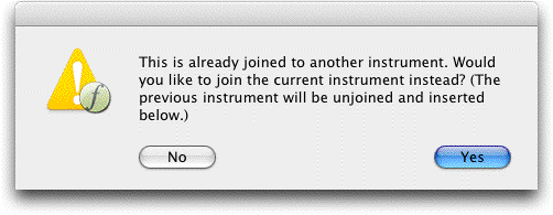 - Congiungi.Cliccate su Congiungi per dire a Finale che gli strumenti sono equivalenti tra i due file che vengono riuniti e che possono essere posizionati sullo stesso rigo. Se lo strumento nel documento di destinazione è già congiunto con un terzo vi verrà mostrato un messaggio di avviso, per consentirvi di scegliere se procedere in questa direzione oppure prendere una decisione diversa.