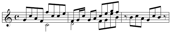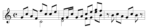 Dopo aver attivato il plug-in Raggruppamento classico degli ottavi le otto corme in tutte le misure di 4/4 verranno sistemate in gruppi di quattro. Le altre combinazioni di note rimarranno invariate. Nell’esempio le otto note nella prima misura e nella seconda metà della misura successiva sono sistemate in gruppi di quattro. Il ritmo croma-semicroma-semicroma nella misura 2 rimane invariato, in accordo con la pratica comune. I gruppi di crome e pause nella misura 3 sono sistemati insieme.