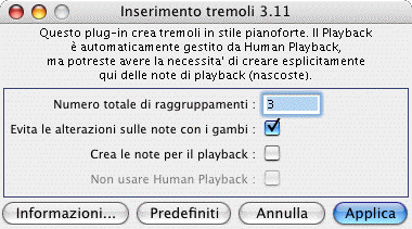 · Chiudi · Predefiniti · Informazioni su. Cliccate su Applica per creare i trilli e mantenere la finestra disponibile per altri intervanti. Cliccate su Chiudi per tornare alla partitura senza effettuare modifiche. Cliccate su Predefiniti per ristabilire i parametri originari impostati in questa finestra di dialogo. Cliccate su Informazioni per avere notizie sulla collezione completa dei plug-in TGTools.