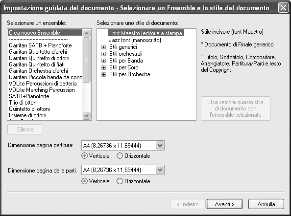 Se non avete ancora lanciato Finale, l’Impostazione guidata dovrebbe avviarsi automaticamente. Se avete già aperto Finale cliccate sul menu File e scegliete Nuovo, quindi Documento con Impostazione guidata. Apparirà la prima pagina dell'Impostazione guidata (Impostazione guidata del documento - Selezionare un Ensemble e lo stile del documento).