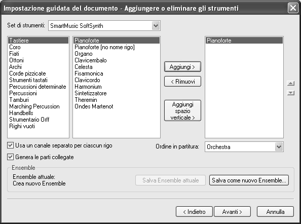 Nota: selezionate l'opzione Genera le parti collegate se volete che vengano create automaticamente le parti collegate per ciascuno strumento inserito in partitura. Se non avete bisogno delle parti staccate deselezionate questa opzione, in modo da ridurre le dimensioni del file. Si veda Tutorial 5: gestione della partitura e delle parti collegate per ulteriori dettagli.