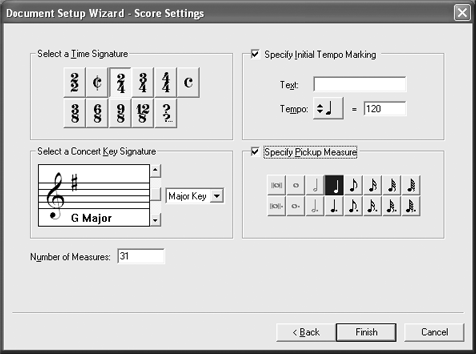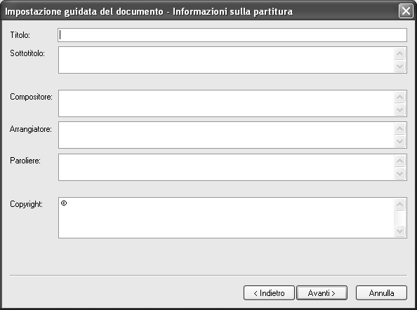 Probabilmente avrete già familiarizzato con le procedure automatizzate (Wizard) presenti in altre applicazioni, come word processor e fogli di calcolo. Questa Impostazione guidata è stata disegnata per aiutarvi nell'impostazione di un vostro nuovo documento di Finale. In questo esempio creeremo una partitura per pianoforte.