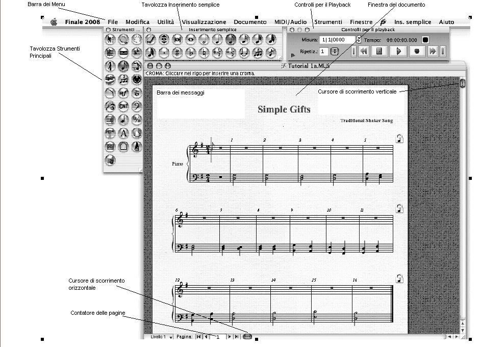 Osservate lo schermo. Lungo il bordo superiore trovate la barra dei menu standard di Finale. Questi menu vi serviranno per gestire il comportamento di Finale per quanto riguarda la visualizzazione, le modifiche e molti altri aspetti ancora. Ci sono undici menu fissi in Finale: Finale 2011, File, Modifica, Utilità, Visualizzazione, Documento, MIDI/Audio, Finestre,