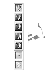 Potete utilizzare gli Strumenti presenti sulle Tavolozze per specificare la durata della nota che volete inserire ed altri eventuali attributi prima di scriverla in partitura. Gli Strumenti di queste Tavolozze sono suddivisi in diveresi gruppi. Vi sono le icone che rappresentano le figure di durata, come le semiminime, le crome, ecc., gli Strumenti per le alterazioni, come il diesis, il bemolle, il bequadro, uno Strumento per le legature di valore, lo Strumento per la creazione di gruppi irregolari e quello per l'inserimento delle notine di abbellimento. Cliccate su una figura di durata per selezionarla; cliccate su un'alterazione, sul punto di valore o sulle legature di valore, per modificare in questo senso la nota. Notate che il puntatore del mouse rappresenta anche lo Strumento selezionato, per aiutarvi a non dimenticarvene mentre lavorate. Cliccate nuovamente sullo Strumento selezionato quando avete terminato di utilizzarlo, per "metterlo via", in modo che non influisca sulle successive note che inserirete.. Se avete selezionato più Strumenti e dovete deselezionarli tutti in favore di un altro, fate semplicemente doppio click sul nuovo Strumento che volete usare.