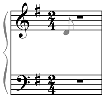 - Cliccate a destra della prima nota per inserire la seconda. Finale raggrupperà le due crome e aggiusterà la spaziatura della musica, adeguando la larghezza della misura in levare. La prima nota della battuta successiva è una semiminima, perciò dobbiamo cambiare figura di durata e selezionare quella che ci serve.