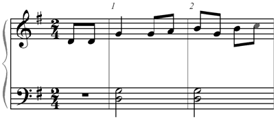 Ora, poiché la battuta 6 richiede la stessa notazione della 5, impareremo a copiare la musica; un procedimento che sveltisce notevolmente la scrittura.