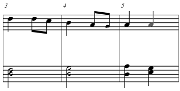 - Completate l'inserimento della musica da misura 3 fino a misura 5, come rappresentato nella figura sottostante. Se scrivete una nota con una durata inesatta, premete semplicemente il tasto Option e, contemporaneamente, premete il numero sul tastierino numerico corrispondente alla durata corretta; la durata della nota verrà modificata.