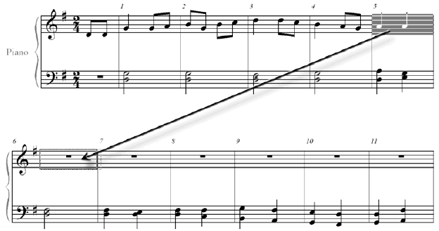 - Cliccate su misura 6, in modo da selezionarla. Anziché trascinare la misura selezionata potete anche usare delle scorciatoie da tastiera per copiare e incollare la musica in un qualsiasi punto della partitura.