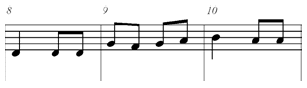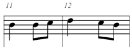 Notate adesso che le misure 11 e 12 hanno lo stesso ritmo della misura 10. Questa è un'ottima opportunità per imparare a copiare delle battute che hanno lo stesso ritmo e poi correggere le altezze delle note