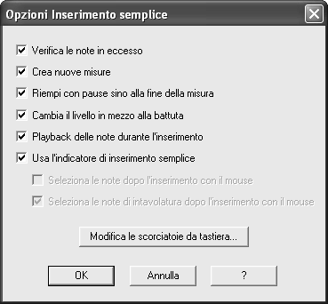 Come abbiamo detto in precedenza, potete modificare e controllare il comportamento dello Strumento Inserimento semplice intervenendo sulle opzioni disponibili nel menu Ins. semplice e nella finestra di dialogo Opzioni Inserimento semplice, come le opzioni Verifica le note in eccesso, Crea nuove misure, Riempi con pause sino alla fine della misura, Cambia il livello in mezzo alla battuta, Playback delle note durante l’inserimento, Usa l’indicatore di inserimento semplice, Seleziona le note dopo l’inserimento con il mouse e Seleziona le note d’intavolatura dopo l’inserimento con il mouse. Per visualizzare tutte queste opzioni, scegliete Opzioni Inserimento semplice dal menu Ins. semplice. Apparirà la finestra di dialogo Opzioni Inserimento semplice. Quando l’opzione Verifica le note in eccesso è selezionata, Finale terrà conto dell’indicazione di tempo e non vi consentirà di inserire più note di quante possibile all’interno di una battuta. L’opzione Riempi con pause sino alla fine della misura fa si che Finale completi una battuta con le pause necessarie quando voi abbandonate la misura stessa per iniziare a scrivere in una successiva. Quando è selezionata l’opzione Seleziona le note dopo l’inserimento con il mouse, vi permette di intervenire immediatamente sull’ultima nota immessa, modificandola attraverso le scorciatoie da tastiera, senza doverla preventivamente selezionare. Per maggiori informazioni si veda la finestra di dialogo Opzioni Inserimento Semplice.