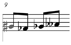 . Cliccate sulla prima nota di misura 9 (il Sol bemolle). Adesso al posto del Sol bemolle apparirà un Sol diesis. Notate anche che Finale metterà automaticamente il bemolle al secondo Sol, in quanto non è più specificato prima. Poiché le alterazioni che abbiamo inserito e cambiato sono del tutto arbitrarie e poco adeguate alla nostra, procediamo ad eliminarle.