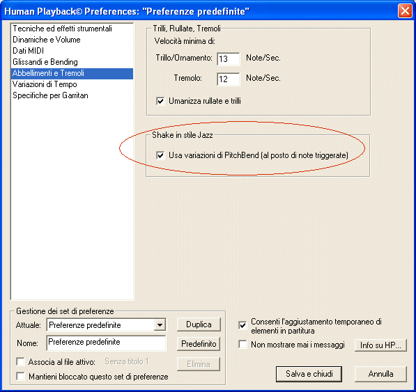 In molte partiture jazz, una linea ondulata o un'indicazione per il trillo sopra le note degli ottoni indica un trillo rapido effettuato con le labbra, chiamato shake. Nella sezione Abbellimenti e tremoli della finestra di dialogo Preferenze di Human Playback, vi è un'opzione specifica per l'interpretazione di queste linee ondulate, indicazioni di tremolo,rappresentate dalla forma intelligente "linea ondulata" o dall'articolazione ~ per far sì che venga utilizzata una variazione del PitchBend per la realizzazione degli shakes in stile jazz anziché un normale trillo: