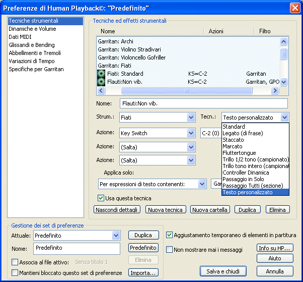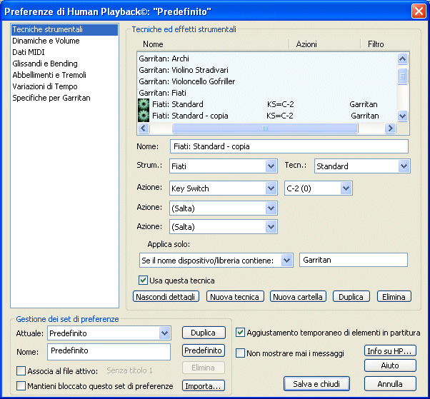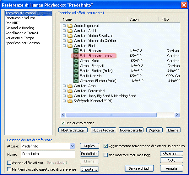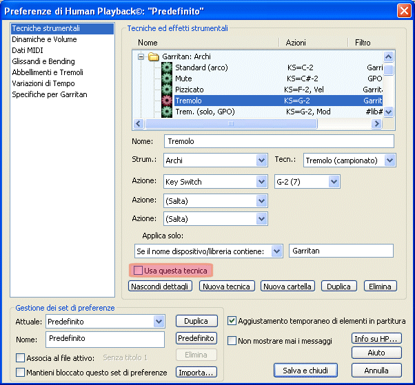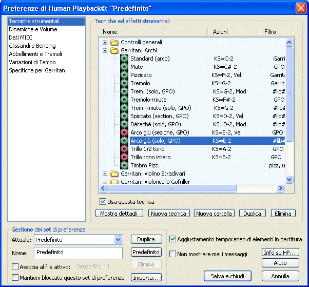 Andate alla sezione Tecniche ed effetti strumentali della finestra di dialogo Preferenze di Human Playback e, nella cartella "Garritan: Archi" selezionate la tecnica "Détaché (solo, GPO)", quindi deselezionate l'opzione "Usa questa tecnica"; ripetete l'operazione per la techina "Down bow (section, GPO)":
