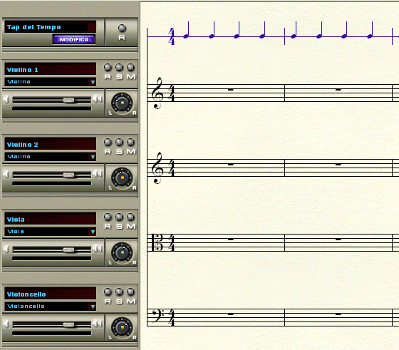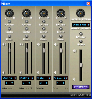 Il mixer di Finale viene visualizzato in una finestra separata, proprio come un banco di missaggio reale, con gli slider per il volume, la manopola per la panoramica e i pulsanti per il Mute, per il Solo e per la registrazione. Questi controlli sono disponibili per ogni singolo strumento (ad ogni strumento in partitura è riservato un modulo di controlli) e si trovano anche sul modulo dei controlli generali, detti controlli Master (il modulo di controlli collocato sul bordo destro del mixer). Vi proponiamo qui sotto l’immagine del mixer di una partitura per quartetto d’archi: