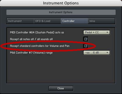 Se usate Kontakt Player: se utilizzate il Kontact Player 2, la prima cosa che dovete sapere di queste due modalità è che lavorano correttamente con gli strumenti Garritan soltanto se l'opzione Use Std. CC#7/CC#10 Volume & Pan è attiva nelle Opzioni di Kontakt Player.