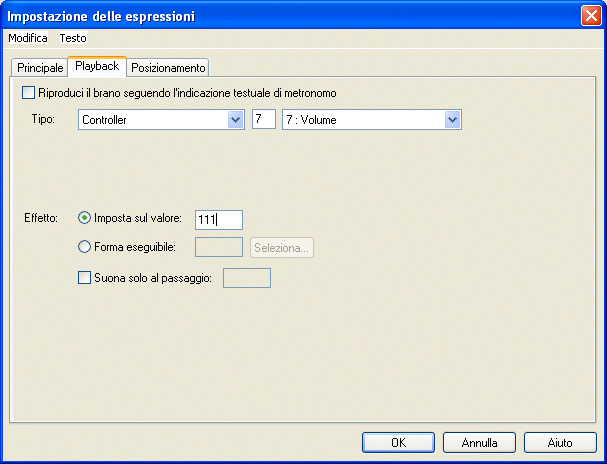 Questo corrisponde ad una registrazione a volume fisso e alla successiva modifica del volume su mixer, in seguito alla registrazione. Assegnando un’espressione configurate per modificare il controller MIDI n.7 corrisponde ad impostare il movimento dello slider del volume su un moderno mixer motorizzato — in altre parole, quest’espressione influenza soltanto il volume e non il timbro.
