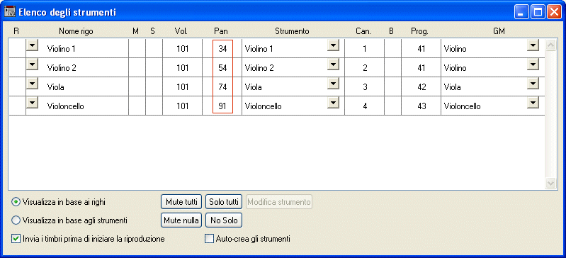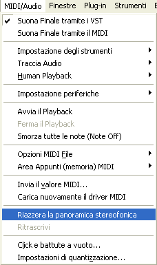 Invece, se state impostando un file creato in precedenza per il playback con gli strumenti della, Finale imposterà la panoramica in modo centrale (il valore predefinito 64) per tutti i nuovi strumenti che inserite. Per ottenere la miglior rappresentazione stereofonica della partitura sulla quale state lavorando, dopo averla configurate per il playback con gli strumenti della GPO, dovrete scegliere la voce Riazzera la panoramica stereofonica dal Menu MIDI/Audio.