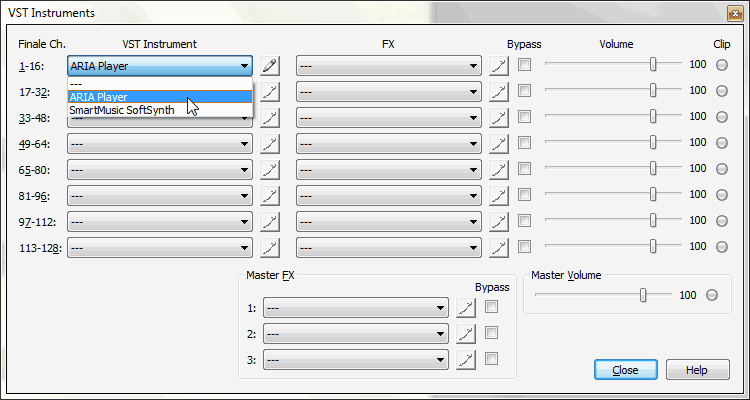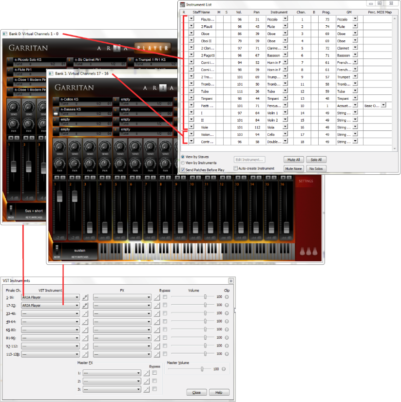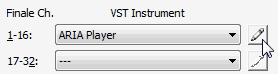 La procedura per caricare gli strumenti è sempre la stessa fin qui descritta. Si possono caricare 16 strumenti su ogni istanza del Garritan Aria Player e questi strumenti dovrebbero corrispondere a quelli assegnati ai canali Channels 1-16 nella finestra Elenco degli strumenti di Finale.